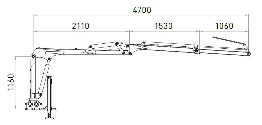 - Teleskopinė strėlė: Leidžia pasiekti rąstus iki 4,7 m atstumu, o transportavimo metu kraną sulankstyti itin kompaktiškai.