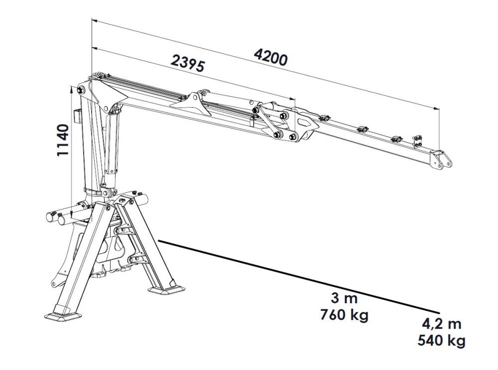 - Padidinta kėlimo jėga: Nors siekis išlieka kompaktiškas (4,2 m), kėlimo momentas siekia net 26 kNm, kas leidžia kelti gerokai sunkesnius rąstus nei baziniai modeliai.